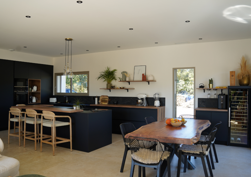 Dans une cuisine aménagée au cœur d’un mas aux murs épais et aux angles droits, l’introduction de formes arrondies crée un contrepoint visuel apaisant. Un îlot central aux coins subtilement arrondis, des étagères suspendues aux courbes douces, ou simplement le choix de poignées galbées suffisent à introduire cette modernité sans renier l’identité du lieu.